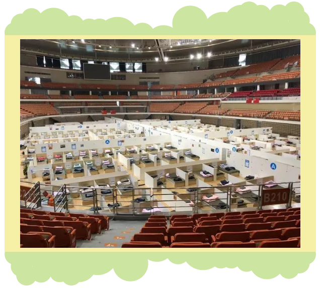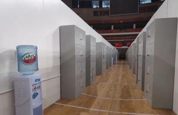 武漢這次為應對疫情推出的“方艙醫(yī)院”,不同于戰(zhàn)時或抗震救災時啟用的野戰(zhàn)移動類醫(yī)院,它是固定地點的、通過大型場館改建的,也就是臨時醫(yī)院的場館改裝版。該方艙醫(yī)院是由武漢體育中心改造而成,專用于收治確診輕癥感染者,共設置床位1000余張,分成兩個艙,每個方艙均嚴格按照三區(qū)兩通道原則設置了清潔區(qū)、緩沖區(qū)、污染區(qū)和醫(yī)務人員通道與患者通道。最大收治量約1100名左右。徐州市第一人民醫(yī)院醫(yī)療隊所在的主體育館改造的方艙設置床位約600張,分為A、B、C、D、E、F六個區(qū),每個區(qū)設床位79-116張不等。艙內(nèi)病區(qū)呈“井”字型安排分布,每排有6個隔間,按照國家緊急醫(yī)學救援隊的指導,床間距在1.1米左右,每個隔間有兩張病床,床上配備了席夢思床墊、2層棉褥、棉被等床上用品,兩張床之間設置有一個床頭柜和電源插座,床頭隔板上有清晰的床號標識。