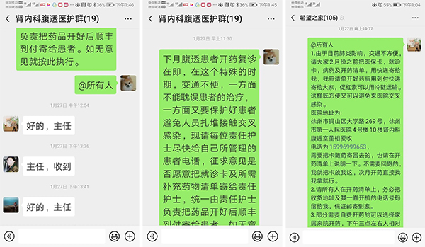 “以人為本”、“用愛服務(wù)”一直是腎內(nèi)科的優(yōu)質(zhì)服務(wù)理念。在抗疫期間,腎內(nèi)科主任王玲帶領(lǐng)醫(yī)護團隊,在線上隨時了解和掌握患者的身體狀況、心理動態(tài),通過開出防控獨特“處方”,向他們推送疫情防控及健康科普知識,答疑解惑,進行“遠程關(guān)懷”,使患者足不出戶安心居家透析,體會到居家透析的好處,真正讓患者得實惠,使患者治療與抗“疫”兩不誤。防控獨特“處方”雖然大大增加了科內(nèi)醫(yī)護人員的工作量,但他們用辛苦換來更多腹透患者家庭的平安與溫馨!