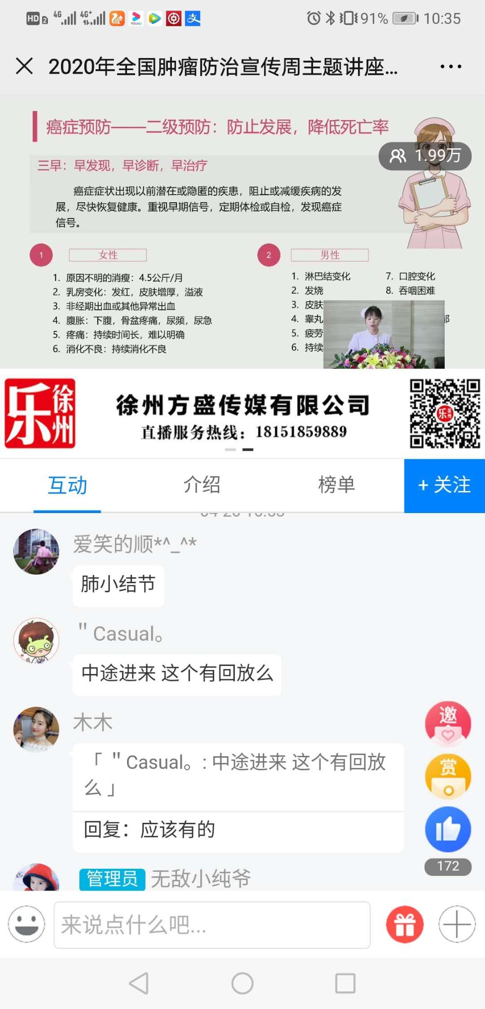 4月20日,舉辦線上科普講座,腫瘤防治專家在線直播腫瘤防治知識。徐醫(yī)附院腫瘤科主任王紅兵《低營養(yǎng)飲食,能夠“餓死腫瘤”?這些營養(yǎng)誤區(qū)要知道》、核醫(yī)學科主任李智勇甲狀腺癌《啥是“碘-131治療”? 》、放療科丁昕博士《遠離內(nèi)因外患,方能“腸”之久安》、甲乳外科醫(yī)師副主任醫(yī)師呂帝《甲狀腺結(jié)節(jié)距離甲狀腺癌有多遠?》、腫瘤中西醫(yī)結(jié)合科護師臧瓊瓊《一起談?wù)勚嗅t(yī)如何調(diào)理和防治腫瘤》、放療科主管護師李瓊瓊《抗癌的食物有哪些?我來幫你分分類》主題演講詼諧幽默、淺顯易懂、實用性強,得到觀眾一致好評,近2萬人在線觀看直播。