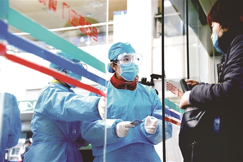 徐州市中心醫(yī)院醫(yī)務(wù)人員對(duì)前來(lái)就診的患者進(jìn)行體溫測(cè)量和證件查驗(yàn)。