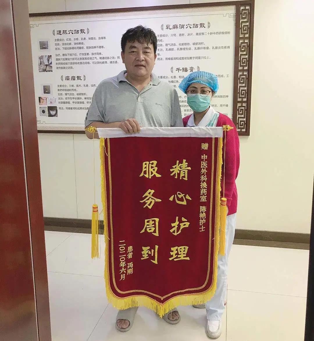 原來,送錦旗的男士名叫馮剛,曾是陳艷護士的患者。 馮先生臀部一側長了皮脂腺囊腫,于本月在中醫(yī)院普外科進行手術。