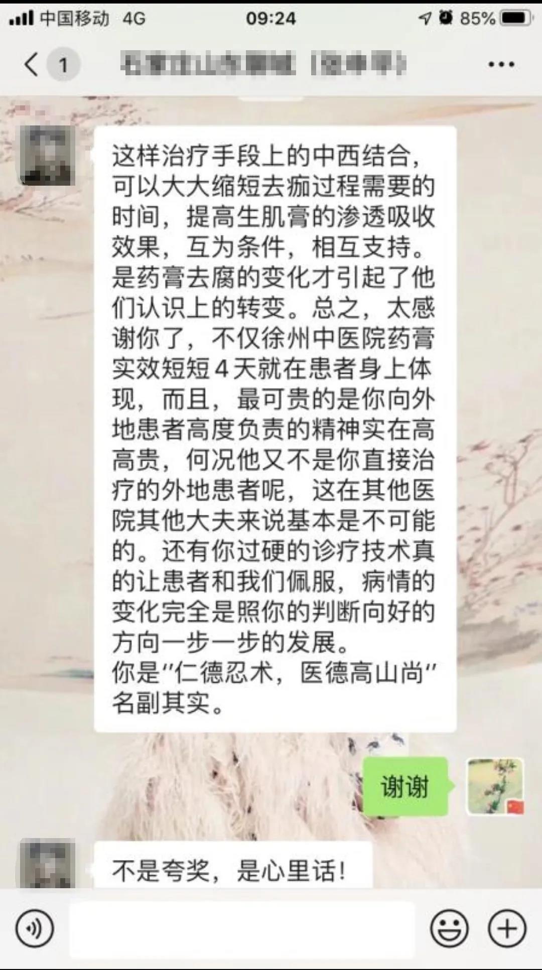 徐州市中醫(yī)院采用中醫(yī)外用膏藥——祛腐生肌膏、生肌散等治療陳年黑痂頑疾,不僅消除了患者多年病痛,還使患處去腐生肌,受到普遍認可和贊嘆。