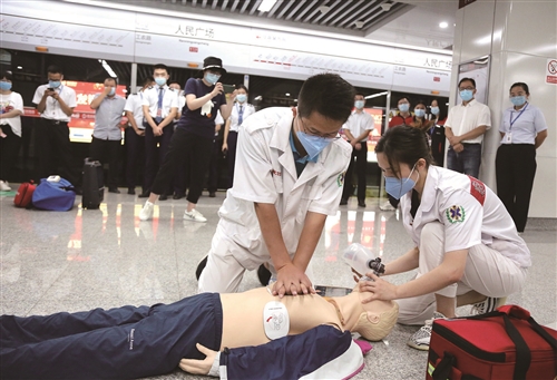 “先生,您怎么樣了?能聽到我說話嗎?”8月13日上午10點(diǎn)多,一名乘客在地鐵1號線人民廣場站站臺候車時突發(fā)疾病,暈倒在地,地鐵站務(wù)員發(fā)現(xiàn)后及時趕到現(xiàn)場……這是一場演習(xí),短短幾分鐘內(nèi),該站點(diǎn)迅速啟動了現(xiàn)場緊急醫(yī)學(xué)救援處置預(yù)案,通過AED自動除顫并配合CPR循環(huán)搶救,最終對昏迷患者搶救成功。讓更多市民了解AED,使公共場所從業(yè)人員急救能力進(jìn)一步提升,是徐州市衛(wèi)健委聯(lián)合徐州地鐵開展此次演練的主要目的。