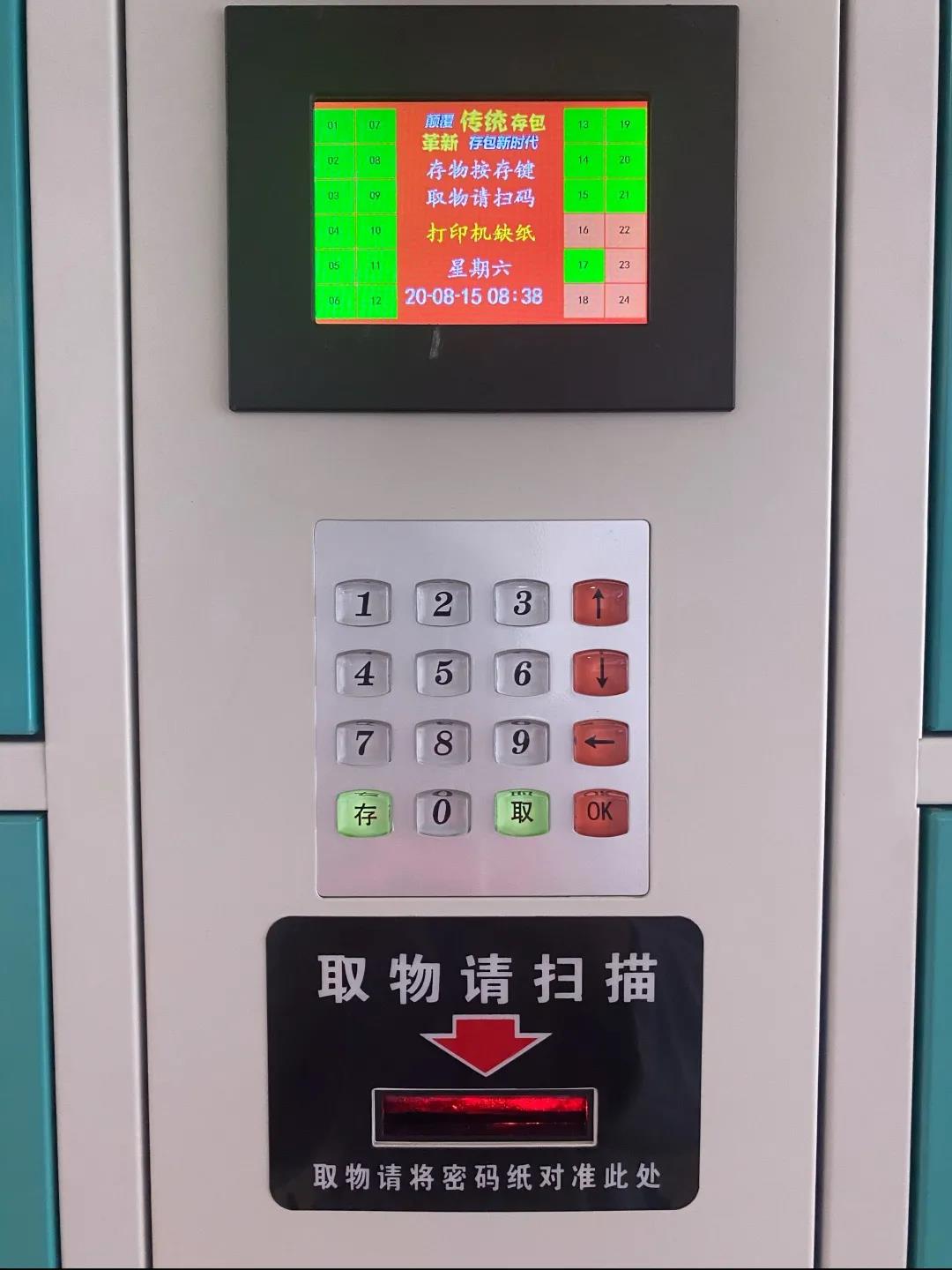 按下鍵盤中的“存”字鍵,寄存柜會吐出一張紙質(zhì)條形碼,取走條形碼并妥善保管,柜門將會打開,此時存入物品、并關閉箱門。