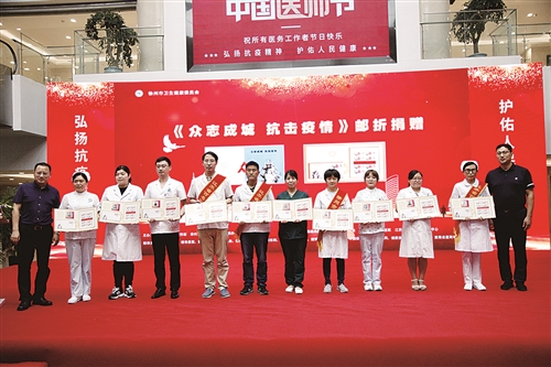 活動現(xiàn)場,為向抗疫英雄致敬,中國郵政集團(tuán)有限公司徐州市分公司為我市258名支援湖北的醫(yī)務(wù)工作者捐贈《眾志成城 抗擊疫情》郵折,10位徐州援湖北醫(yī)務(wù)人員代表上臺接受捐贈。
