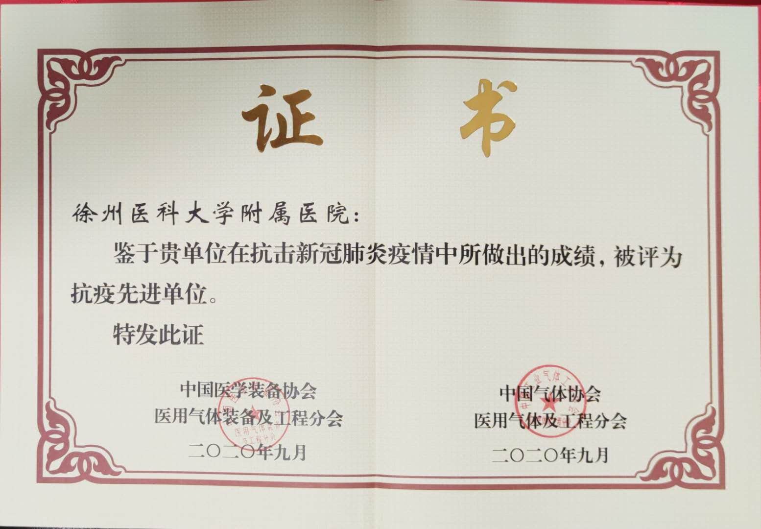 根據(jù)徐醫(yī)附院在疫情防控期間所開展的工作和取得的成績(jī),中國(guó)醫(yī)學(xué)裝備協(xié)會(huì)醫(yī)用氣體裝備及工程分會(huì)、中國(guó)氣體協(xié)會(huì)醫(yī)用氣體及工程分會(huì)把我院評(píng)為“醫(yī)用氣體行業(yè)醫(yī)院抗疫先進(jìn)單位”。