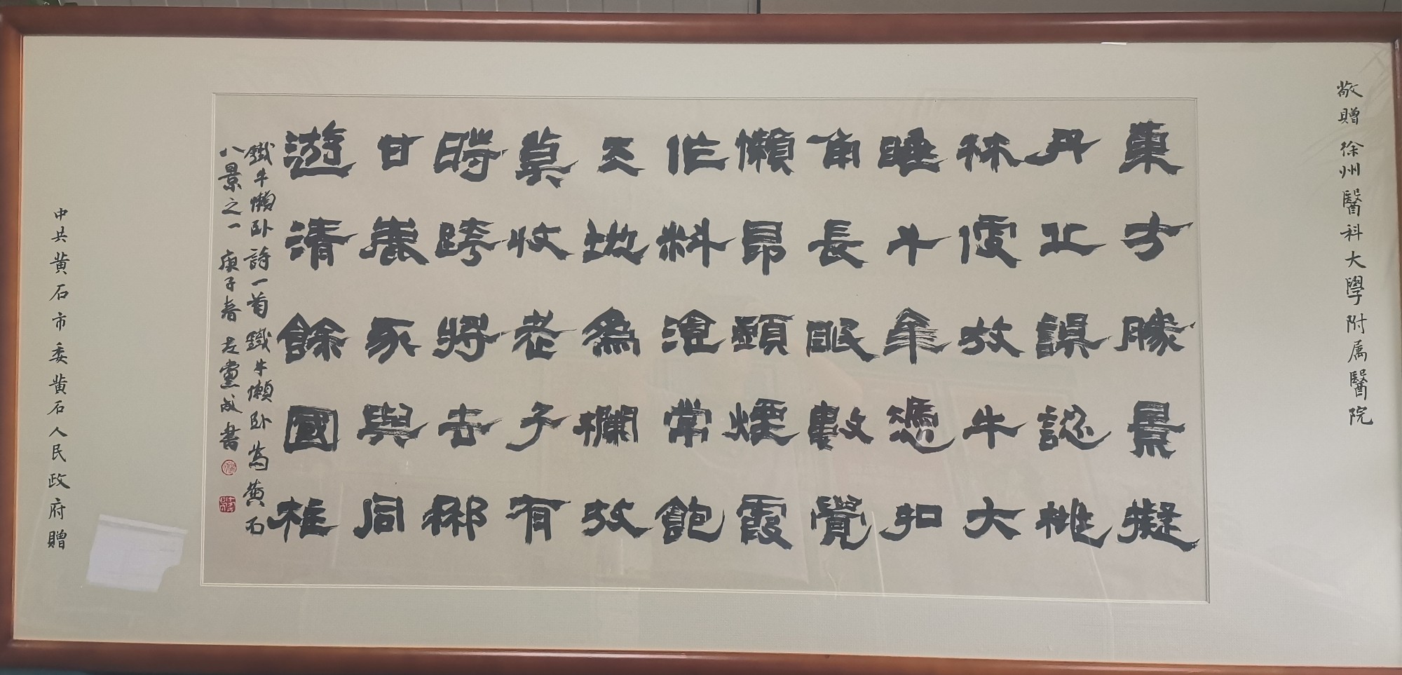 黃淮網(wǎng)(王夢琳)   近日,湖北省黃石市市委市政府贈送徐州醫(yī)科大學(xué)附屬醫(yī)院書法作品一幅,對疫情期間援黃石醫(yī)療隊(duì)員的無私奉獻(xiàn)表示感謝。該書法作品為湖北書法家協(xié)會創(chuàng)作研究員、湖北三楚書畫院副院長、黃石市書法家協(xié)會副主席左黨成所書鐵牛懶臥詩一首,鐵牛懶臥為黃石八景之一。