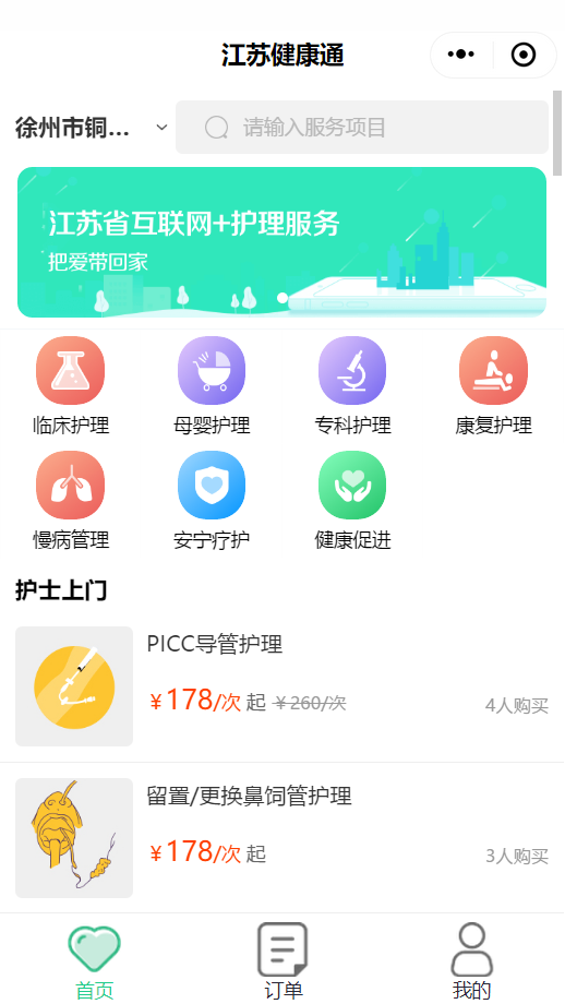 目前,徐州市第一人民醫(yī)院“互聯(lián)網(wǎng)+護(hù)理服務(wù)”上線了PICC導(dǎo)管護(hù)理、留置/更換鼻飼管護(hù)理、新生兒皮膽紅素測定、生命體征測量、自理能力訓(xùn)練指導(dǎo)等服務(wù)近50項(xiàng),涵蓋了臨床、母嬰、?啤⒖祻(fù)、慢病管理、安寧療護(hù)、健康促進(jìn)等7大類別常見護(hù)理服務(wù)。