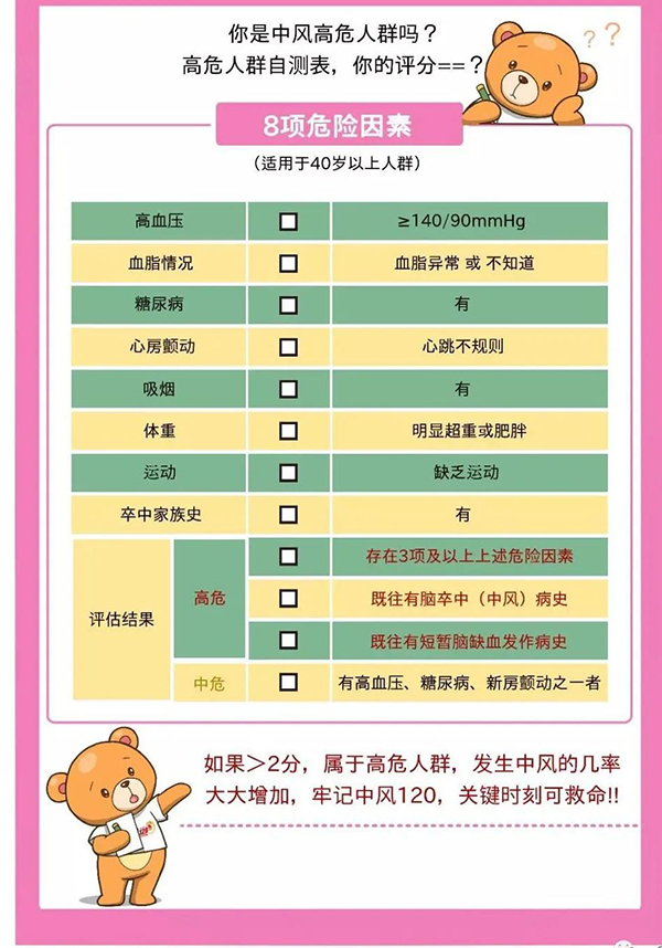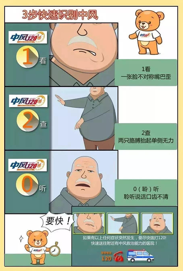 腦卒中主要分為缺血性卒中和出血性卒中,其中臨床80%以上屬于缺血性卒中,吸煙、酗酒、肥胖、高血壓、糖尿病、心臟病、高脂血癥等患者均為卒中的高發(fā)人群,早預(yù)防、早發(fā)現(xiàn),盡早到達(dá)醫(yī)院為缺血性卒中的治療爭取有效的時間: