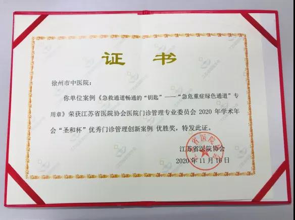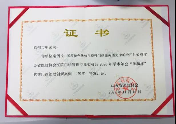 徐州市中醫(yī)院榮獲“江蘇省醫(yī)院協(xié)會(huì)門診管理專業(yè)委員會(huì)2020年學(xué)術(shù)年會(huì)‘圣和杯’優(yōu)秀門診管理創(chuàng)新案例獎(jiǎng)”