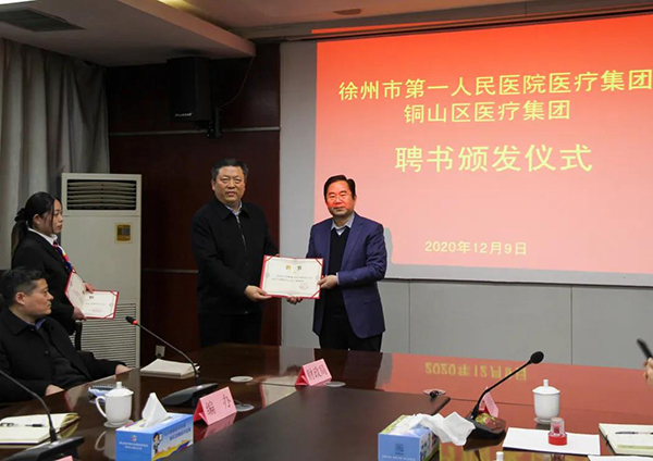 黃淮網(wǎng)   12月9日,徐州市第一人民醫(yī)院醫(yī)療事業(yè)集團聘書頒發(fā)儀式在銅山區(qū)政府舉行。銅山區(qū)副區(qū)長周保春代表區(qū)政府向我院黨委書記、醫(yī)療事業(yè)集團理事長杜鐘祥授予 “銅山區(qū)人民醫(yī)院院長”、“銅山區(qū)大彭鎮(zhèn)衛(wèi)生院院長”、“銅山區(qū)焦山社區(qū)衛(wèi)生服務(wù)中心主任”、“銅山區(qū)文沃社區(qū)衛(wèi)生服務(wù)中心主任”、“銅山區(qū)驛城社區(qū)衛(wèi)生服務(wù)中心主任”職務(wù)并頒發(fā)證書,標志著醫(yī)院事業(yè)集團實行統(tǒng)一法人管理,集團改革邁出新步伐。