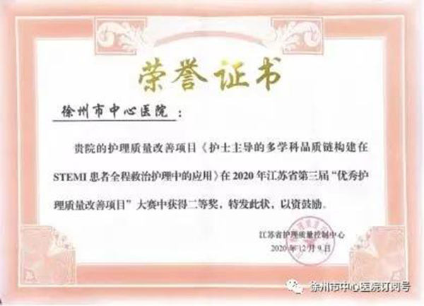 為分享和展示護理質(zhì)量改善成效,激勵廣大護理人員不斷提高護理質(zhì)量,用專業(yè)改善患者的健康問題。江蘇省護理質(zhì)量控制中心于今年11 月舉行了江蘇省第三屆“優(yōu)秀護理質(zhì)量改善項目”評選活動,本次大賽參賽項目共計154 項,經(jīng)過多輪嚴謹公正的專家評審,本次大賽評選出一等獎2 項,二等獎8 項,三等獎10 項,優(yōu)秀獎20 項。在12 月26 日第三屆江蘇省護理質(zhì)量表彰大會上,徐州市中心醫(yī)院沈瑩、莊海峰、張學萍等護士長組成的護理團隊項目“護士主導的多學科品質(zhì)鏈構(gòu)建在STEMI 患者全程救治護理中的應用”榮獲此次大賽二等獎。