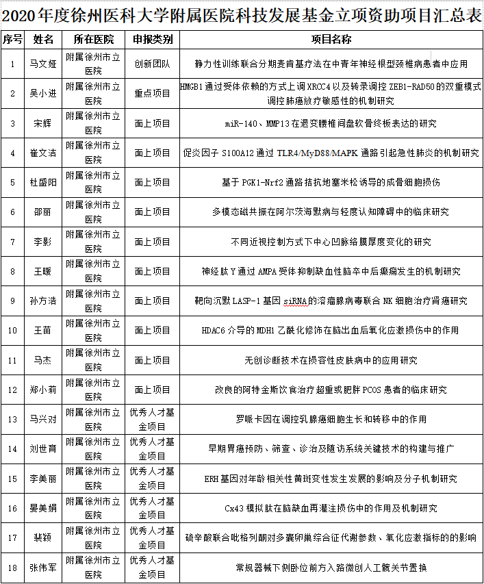 2020年度徐州醫(yī)科大學(xué)附屬醫(yī)院科技發(fā)展基金立項資助項目匯總表