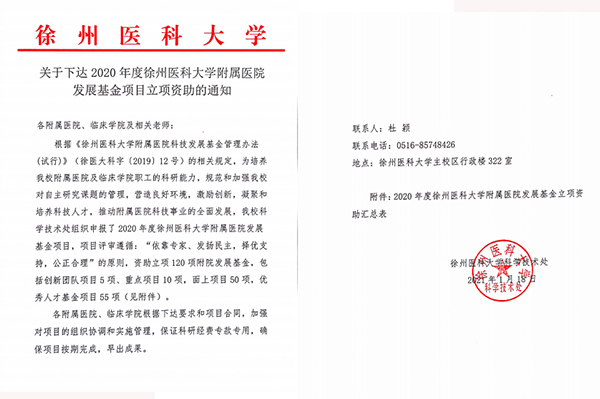 為培養(yǎng)徐州醫(yī)科大學(xué)附屬醫(yī)院及臨床學(xué)院職工的科研能力,規(guī)范和加強學(xué)校對自主研究課題的管理,營造良好環(huán)境,激勵創(chuàng)新,凝聚和培養(yǎng)科技人才,徐州醫(yī)科大學(xué)2020年12月在21家附屬醫(yī)院及15家臨床學(xué)院范圍內(nèi)啟動開展2020年度徐州醫(yī)科大學(xué)附屬醫(yī)院科技發(fā)展基金項目的申報工作。經(jīng)過學(xué)校學(xué)術(shù)委員會專家評審評議,共有120個科研項目獲得立項,徐州市第一人民醫(yī)院獲批18項。徐州醫(yī)科大學(xué)附屬醫(yī)院科技發(fā)展基金的設(shè)立,是徐州醫(yī)科大學(xué)為深入貫徹黨的十九大、十九屆五中全會精神,鼓勵附屬醫(yī)院及臨床學(xué)院職工開展科技創(chuàng)新活動的重要措施,旨在推動附屬醫(yī)院科技事業(yè)的全面發(fā)展。