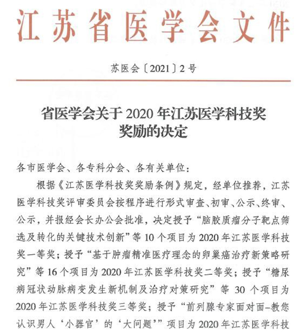近日,江蘇省醫(yī)學(xué)會正式下文,公布了江蘇省醫(yī)學(xué)會關(guān)于2020年江蘇醫(yī)學(xué)科技獎獎勵的決定。徐州醫(yī)科大學(xué)附屬醫(yī)院包攬江蘇醫(yī)學(xué)獎一、二、三等獎。