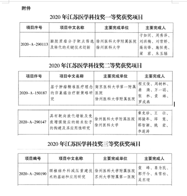 徐醫(yī)附院神經(jīng)外科于如同教授團(tuán)隊(duì)以“腦膠質(zhì)瘤分子靶點(diǎn)篩選及轉(zhuǎn)化的關(guān)鍵技術(shù)創(chuàng)新”項(xiàng)目斬獲江蘇醫(yī)學(xué)獎一等獎,放療科章龍珍教授團(tuán)隊(duì)以“具有靶向放化增敏及免疫增強(qiáng)效應(yīng)的納米粒子的構(gòu)建及其應(yīng)用性研究”項(xiàng)目獲江蘇醫(yī)學(xué)獎二等獎,骨科袁峰教授團(tuán)隊(duì)以“頸椎病外科減壓重建技術(shù)的基礎(chǔ)和應(yīng)用研究”項(xiàng)目獲江蘇醫(yī)學(xué)獎三等獎,同時,徐醫(yī)附院婦產(chǎn)科經(jīng)莉主任參與的“基于腫瘤精準(zhǔn)醫(yī)療理念的卵巢癌治療新策略研究”項(xiàng)目獲江蘇醫(yī)學(xué)獎二等獎,徐醫(yī)附院為第二完成單位。