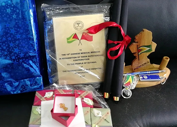 2月5日,圭亞那衛(wèi)生部為15期醫(yī)療隊每位隊員頒發(fā)了一枚徽章,喬治敦醫(yī)院為15期喬治敦分隊頒發(fā)了獎牌和每人一份禮物,已轉(zhuǎn)交大使館,現(xiàn)在正在快遞途中。