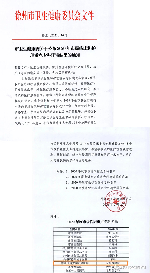 黃淮網(wǎng) 近日,徐州市衛(wèi)健委公布了2020年度市級臨床和護(hù)理重點(diǎn)?圃u審結(jié)果,徐州醫(yī)科大學(xué)附屬醫(yī)院全科醫(yī)學(xué)科經(jīng)過醫(yī)院推薦、材料申報、資格審查、書面審核、現(xiàn)場評審及結(jié)果公示等程序,被授予市級臨床重點(diǎn)?茊挝,為徐州市首批通過全科醫(yī)學(xué)科臨床重點(diǎn)專科評審的單位,為徐醫(yī)附院第38個徐州市臨床重點(diǎn)專科。