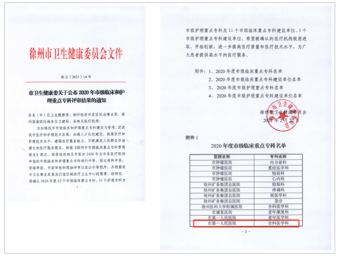 值得一提的是,近日,徐州市衛(wèi)健委公布了2020年度市級臨床和護理重點?圃u審結(jié)果,徐州市第一人民醫(yī)院全科醫(yī)學(xué)科經(jīng)過醫(yī)院推薦、材料申報、資格審查、書面審核、現(xiàn)場評審及結(jié)果公示等程序,被授予市級臨床重點?茊挝唬瑸樾熘菔惺着ㄟ^全科醫(yī)學(xué)科臨床重點?圃u審的單位。