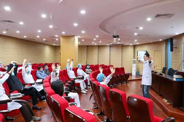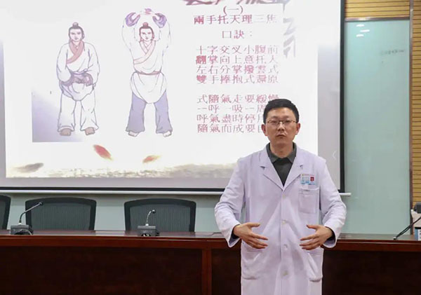 常寧遒從中醫(yī)角度分析了春季運動的好處,一年之計在于春,春季適當(dāng)多鍛煉,會增強免疫力與抗病能力,同時就日常生活中大家關(guān)心的頸椎病預(yù)防等,為大家現(xiàn)場教學(xué)了八段錦中“兩手托天理三焦”的動作要領(lǐng),臺下聽課人員現(xiàn)場積極模仿,氣氛輕松愉快。