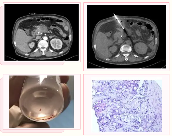 患者李某,男,60歲,因“反復(fù)上腹部隱痛1月余”到徐州市第一人民醫(yī)院就診,腹部MRI及CT提示胰頭占位、肝內(nèi)多發(fā)占位,考慮胰頭癌并肝內(nèi)多發(fā)轉(zhuǎn)移可能性大,輾轉(zhuǎn)多家醫(yī)院未能明確病理,無(wú)法制定準(zhǔn)確治療方案。為明確診斷,腫瘤中心微創(chuàng)診療團(tuán)隊(duì)反復(fù)研究穿刺方案及其可行性,最終認(rèn)為本病例有一定的操作空間,建議患者行胰腺腫物穿刺活檢術(shù)。此次穿刺有很高的風(fēng)險(xiǎn),胰腺位于人體腹部的中心,前有胃腸道覆蓋,后有脊柱和腎臟阻擋,左有脾臟環(huán)繞,右有肝臟攔截;另外,胰腺血供極其豐富,且胰腺頭部周圍血管縱橫交錯(cuò)、交通成網(wǎng),穿刺很難完全避開這些血管,易出現(xiàn)胃腸道穿孔、出血、胰漏、感染等風(fēng)險(xiǎn)。因此該項(xiàng)技術(shù)是一項(xiàng)準(zhǔn)入門檻極高的“高、精、尖”的臨床診療技術(shù)。為了保證穿刺成功,術(shù)前給患者采用禁食、胃腸減壓、抗感染、抑酸、止血、止疼等預(yù)防措施,術(shù)中制定合適穿刺路徑。穿刺過程順利,一針直達(dá)病灶,順利取到病灶組織,術(shù)后復(fù)掃CT幾乎未見出血征象,患者安返病房。術(shù)后病理明確為胰頭中-低分化腺癌,后于腫瘤中心接受放化療等綜合治療。此次穿刺活檢術(shù)是徐州市第一人民醫(yī)院首高難度胰腺腫物穿刺活檢術(shù),填補(bǔ)了徐州市一院該項(xiàng)技術(shù)的空白。
