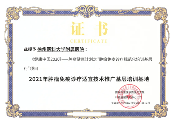 徐醫(yī)附院被國家衛(wèi)健委醫(yī)藥衛(wèi)生科技發(fā)展研究中心授予2021年腫瘤免疫診療適宜技術(shù)推廣基層培訓基地