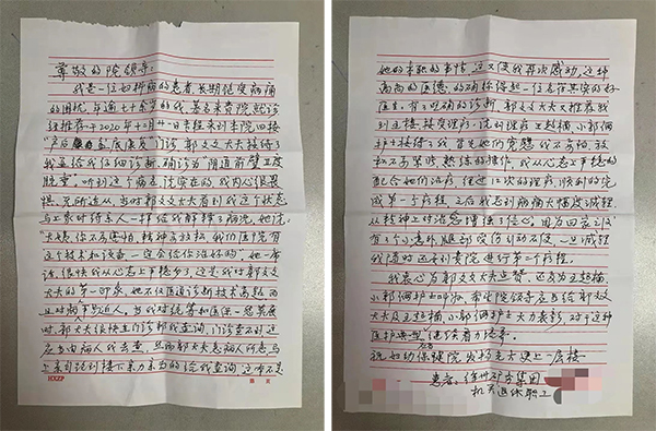 年逾七旬的患者池女士,就是這封信的執(zhí)筆者。她在信中講述了自己在徐州市婦幼保健院康復(fù)科的就診過程,言語(yǔ)之間對(duì)醫(yī)護(hù)人員充滿感激。