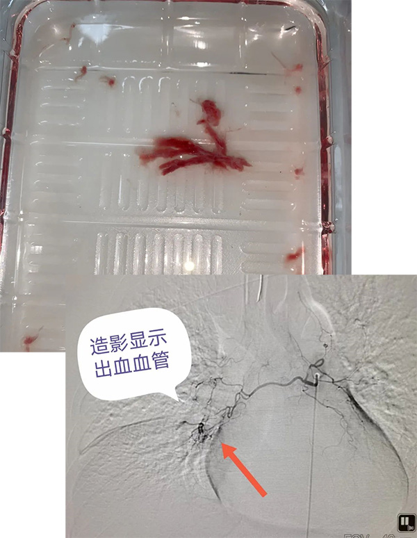 根據多學科會診方案,患者被立即轉入東院ICU。在東院ICU孟雷主任醫(yī)師指導和田國棟主治醫(yī)師協(xié)助下,東院呼吸與危重癥醫(yī)學科孫理想主治醫(yī)師為患者行全麻氣管插管下支氣管鏡下止血及咯血原因探查,氣管內見大量血凝塊,予以清除后,氧合漸改善,但右下葉基底段支氣管見活動性出血不止,經壓迫及藥物止血后,局部血凝塊形成,出血漸止,循環(huán)穩(wěn)定。此舉明確了出血部位。其后,將患者轉至介入導管室進一步行急診支氣管動脈造影+栓塞治療。由介入放射科王勇副主任醫(yī)師操作、楊晶醫(yī)師協(xié)助,立即行介入造影檢查見右側支氣管動脈增粗、扭曲、行走紊亂,支氣管動脈-肺動脈瘺形成,立即予栓塞治療,未再出血;颊叻祷貣|院呼吸與危重癥醫(yī)學科普通病房。