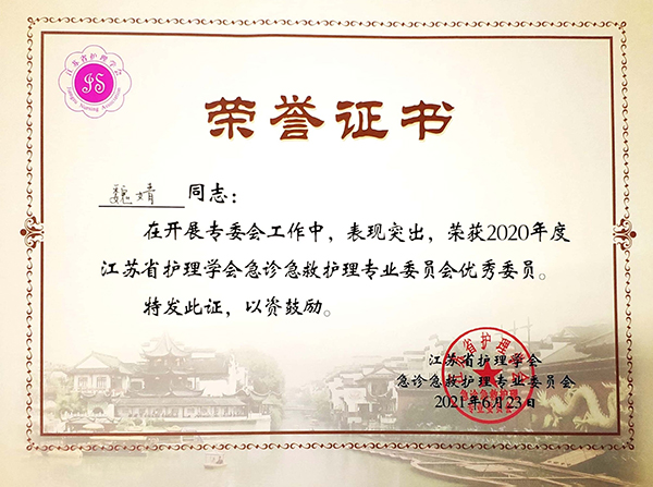 6月23日下午首先召開了江蘇省護理學(xué)會急診急救護理專委會全體委員會議,魏婧護士長在開展專委會工作中表現(xiàn)突出,榮獲優(yōu)秀委員榮譽稱號。