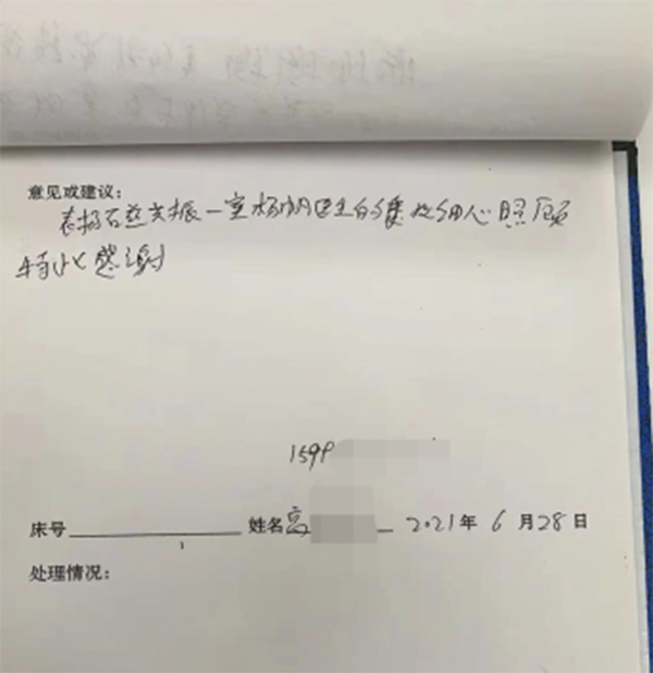 檢查結(jié)束后高先生異常激動,對徐州市一院影像中心的專業(yè)檢查水平和耐心、細(xì)致的服務(wù)表示感謝,特別感謝了楊帆醫(yī)生的敬業(yè)精神和專業(yè)、周到、認(rèn)真、貼心的服務(wù),并多次強調(diào)有時間就要來徐州市一院做義工,協(xié)助影像中心的工作,幫助更多的患者順利完成檢查,并在意見本上留下了感謝的話語。樸實的語言,所表達(dá)的不僅僅是患者對醫(yī)生的感激之情,更是對徐州市一院醫(yī)務(wù)人員醫(yī)德醫(yī)風(fēng)、醫(yī)療技術(shù)、服務(wù)質(zhì)量的認(rèn)同與褒獎。