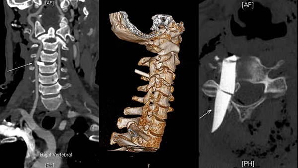 急診外科主任姚愛明主任醫(yī)師接到病情匯報后很快抵達現(xiàn)場,CT結(jié)果令現(xiàn)場所有人大吃一驚:CT顯示玻璃碎片像尖刀一樣刺入頸椎3/4之間,卡在脊髓和椎動脈之間。此處脊髓位置較高,一旦損傷輕則癱瘓,重則隨時心跳呼吸驟停而亡,彌漫性氣顱提示硬膜已經(jīng)破裂!CTA顯示椎動脈被明顯壓迫,隨時可能破裂出血,導致失血性休克、大面積缺血性腦梗死,腦疝甚至死亡!且殘留玻璃碎片中間斷裂破碎,可能無法完全取出,給手術(shù)增加了極大的難度!