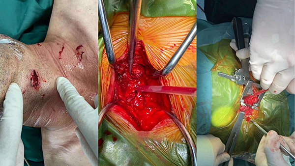 術(shù)中發(fā)現(xiàn),玻璃碎片從舌骨及甲狀軟骨之間,由左前至右后刺穿喉咽前后壁,并繼續(xù)向后刺穿并卡入頸3/4椎體之間,硬膜破裂腦脊液外漏,椎動脈未見明顯破裂出血。經(jīng)過4個多小時緊張有序的手術(shù),姚愛明主任帶領(lǐng)其團隊成功取出殘留體內(nèi)的碎片,并行硬膜修補。劉穩(wěn)主任進行了喉咽部損傷的探查及修補。兩次術(shù)中喚醒及術(shù)后觀察患者四肢活動良好,手術(shù)成功!術(shù)后護送至神經(jīng)外科ICU監(jiān)護治療,患者后續(xù)仍需渡過氣管瘺、傷口感染、肺部感染、腦脊液漏及顱內(nèi)感染等難關(guān)。