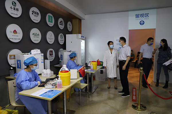 下午,金培生一行冒著大雨先后來到銅沛社區(qū)產(chǎn)業(yè)園接種點、萬科人才家園接種點和蘇寧接種點,實地查看疫苗接種點運轉(zhuǎn)情況,詳細了解現(xiàn)場保障措施、疫苗存儲管理、醫(yī)護人員的輪崗安排及疫苗實際接種等情況。