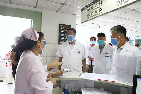 為積極應(yīng)對(duì)當(dāng)前疫情防控新形勢(shì),抓緊抓實(shí)抓細(xì)疫情防控工作,8月5日上午,徐州醫(yī)科大學(xué)附屬醫(yī)院領(lǐng)導(dǎo)王人顥、金培生、徐凱、談在祥、宋軍、王志萍帶領(lǐng)黨辦、院辦、醫(yī)務(wù)處、護(hù)理部、門診部、感染管理科、總務(wù)處、保衛(wèi)處等職能部門負(fù)責(zé)人,分兩組分別由王人顥書記和金培生常務(wù)副院長(zhǎng)帶隊(duì),前往一線深入督導(dǎo)檢查疫情防控工作開展情況。