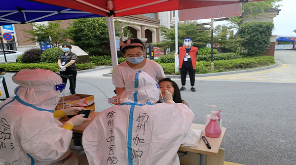 疫情就是命令。接到任務后,我們沒有片刻遲緩,第一時間便跟隨大隊伍乘車來到指定的核酸采集點。這次我們是4人一小組:領(lǐng)隊鄭領(lǐng)領(lǐng),劉敏,劉驊靖和我分到的地點是果園區(qū),這里大部分人是因為疫情原因而不能回家的打工人員,由于衛(wèi)生條件限制,加之語言溝通困難,我們需要更加耐心地對其進行指導、消毒、采樣。熾熱的天氣不僅考驗著我們的耐心,更考驗著我們的意志。汗水順著我的臉頰緩緩流下,我卻渾然不覺,等到脫下衣服時,才發(fā)現(xiàn)衣服已經(jīng)全部濕透了。
