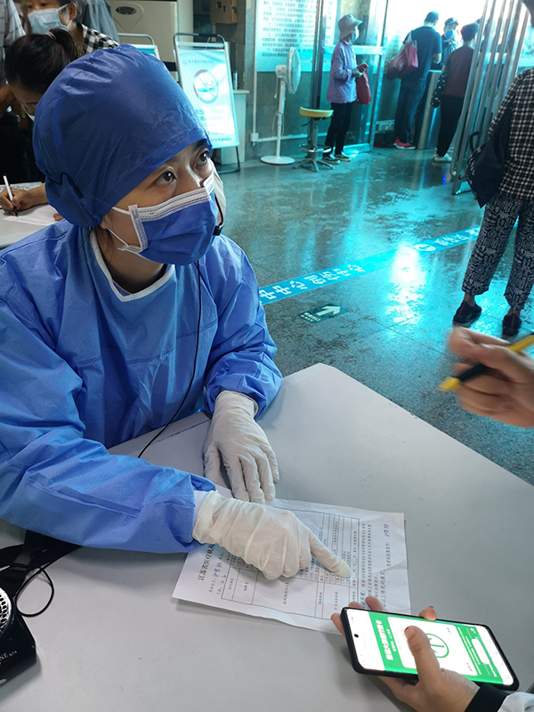 門診流調(diào)是疫情防控的第一道“防火墻”。健康管理中心支援門診的人員需要第一時(shí)間確認(rèn)就診病人的流行病學(xué)接觸史,一個(gè)人一個(gè)人地、一句話一句話地指導(dǎo)病人填報(bào)各類表格材料,在酷暑烈日下,在門診廣場(chǎng)穿著悶熱的隔離衣,每天都頂著高溫的考驗(yàn)。大家在結(jié)束了一天的工作后,常常嗓子已經(jīng)說(shuō)不出話來(lái),但是大家知道疫情就是命令,防控就是責(zé)任,工作人員要以最飽滿的熱情和最昂揚(yáng)的斗志在這場(chǎng)沒(méi)有硝煙的防疫中貢獻(xiàn)力量。