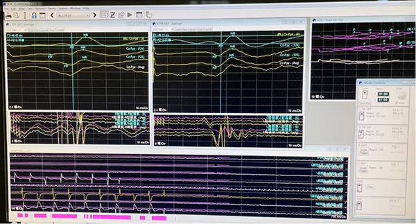 術(shù)中神經(jīng)電生理監(jiān)測,就是監(jiān)測感覺和運動傳導(dǎo)通路以及大腦皮層的電生理信號,快速有效地評判意識狀態(tài)改變(例如昏迷、麻醉)的患者神經(jīng)功能的完整性。常用的術(shù)中神經(jīng)電生理監(jiān)測技術(shù)包括:軀體感覺誘發(fā)電位(SSEP)、運動誘發(fā)電位(MEP)、腦干聽覺誘發(fā)電位(BAEP)、視覺誘發(fā)電位(VEP)、肌電圖(EMG)等。這項技術(shù)客觀監(jiān)測患者神經(jīng)系統(tǒng)的生物電活動,不僅可以減少和避免神經(jīng)結(jié)構(gòu)的損傷,還可以幫助辨別影像技術(shù)不易識別的特定神經(jīng)結(jié)構(gòu)和界限,從而幫助手術(shù)醫(yī)師及時、準(zhǔn)確地了解神經(jīng)功能的狀態(tài),降低手術(shù)致殘率和防止永久性神經(jīng)損傷。