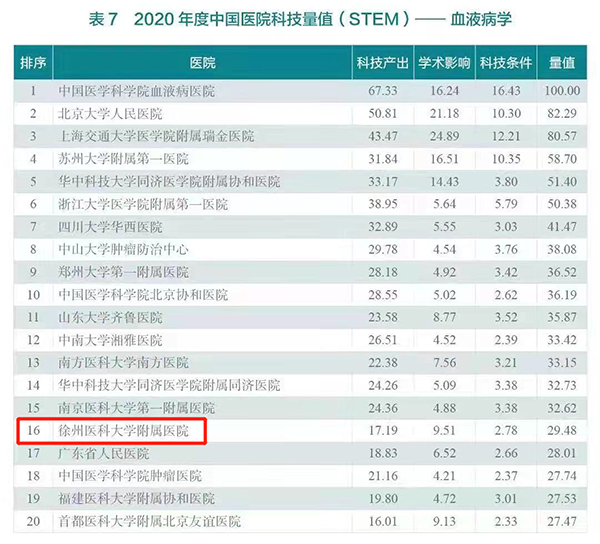 徐醫(yī)附院血液科近些年圍繞造血干細(xì)胞移植并發(fā)癥的發(fā)生機(jī)制與預(yù)警標(biāo)志物臨床應(yīng)用、白血病和骨髓瘤干細(xì)胞研究與靶向治療等方向開展科學(xué)研究,在學(xué)科地位與影響力、科研能力與產(chǎn)出、人才梯隊(duì)建設(shè)、醫(yī)療技術(shù)水平等方面全面提升,尤其是近年開展的CAR-T細(xì)胞治療血液腫瘤,無論是新靶點(diǎn)開發(fā),還是臨床應(yīng)用方面均處于國內(nèi)和國際領(lǐng)先水平。在中國醫(yī)學(xué)科學(xué)院最新發(fā)布的2020年度中國醫(yī)院STEM排名中,徐州醫(yī)科大學(xué)附屬醫(yī)院血液科在1600余家參評醫(yī)院中脫穎而出,排名第16位(2017年為第30位),彰顯了國內(nèi)外同行對徐醫(yī)附院血液科工作的認(rèn)可。