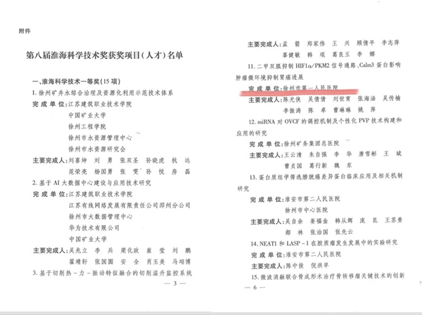 其中,徐州市第一人民醫(yī)院陳光俠、吳倩倩、劉世育等同志完成的科研成果《二甲雙胍抑制HIF1a/PKM2信號通路、Calm3蛋白影響腫瘤微環(huán)境抑制胃癌進展》獲得一等獎;司明宇、邵新香、范可順等同志完成的科研成果《上直肌轉(zhuǎn)位治療外展神經(jīng)麻痹》獲得二等獎。