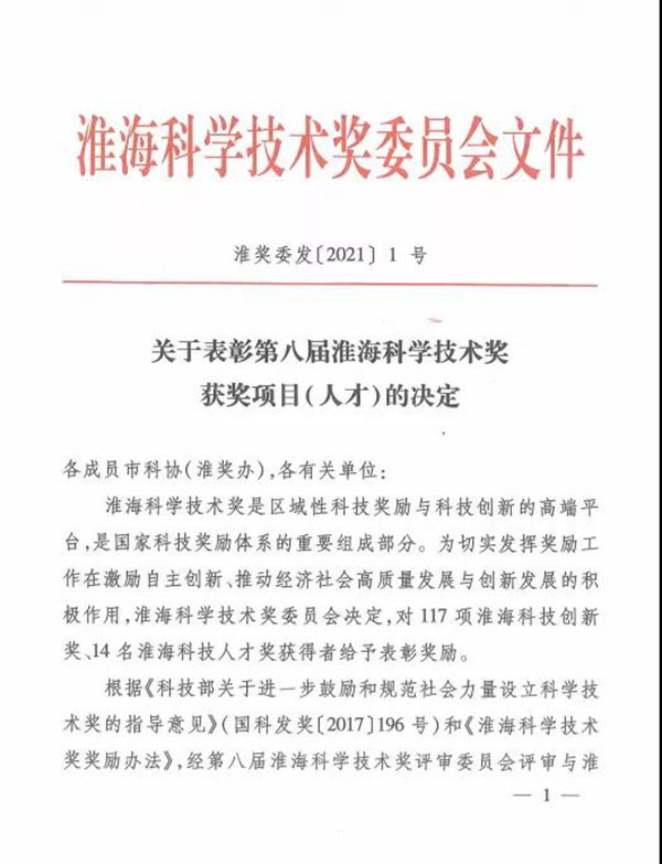 黃淮網(wǎng) 根據(jù)《國家科學(xué)技術(shù)獎勵條例》(國務(wù)院令第731號)、《科技部關(guān)于進一步鼓勵和規(guī)范社會力量設(shè)立科學(xué)技術(shù)獎的指導(dǎo)意見》(國科發(fā)獎〔2017〕196號)和《淮?茖W(xué)技術(shù)獎獎勵辦法》等有關(guān)規(guī)定,淮?茖W(xué)技術(shù)獎委員會辦公室組織開展了第八屆淮海科學(xué)技術(shù)獎申報工作。經(jīng)過個人申報、單位推薦、形式審查、專業(yè)初審、復(fù)審等環(huán)節(jié),評選出科技創(chuàng)新獎項目117項。