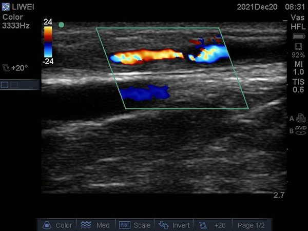 患者李某,男,51歲,規(guī)律血液透析,5年前在徐醫(yī)附院行自體動(dòng)靜脈內(nèi)瘺(AVF)。近期AVF震顫減弱,流量欠佳,只能達(dá)到200ml/min,遂到徐醫(yī)附院就診。術(shù)前超聲檢查示AVF動(dòng)脈穿刺點(diǎn)上游血管狹窄,長(zhǎng)度約4cm,最狹窄處僅有2.5mm,伴吻合口狹窄;颊呓(jīng)過(guò)PTA治療,AVF震顫明顯增強(qiáng),流量達(dá)到1793ml/min,完全滿足透析要求,手術(shù)成功。