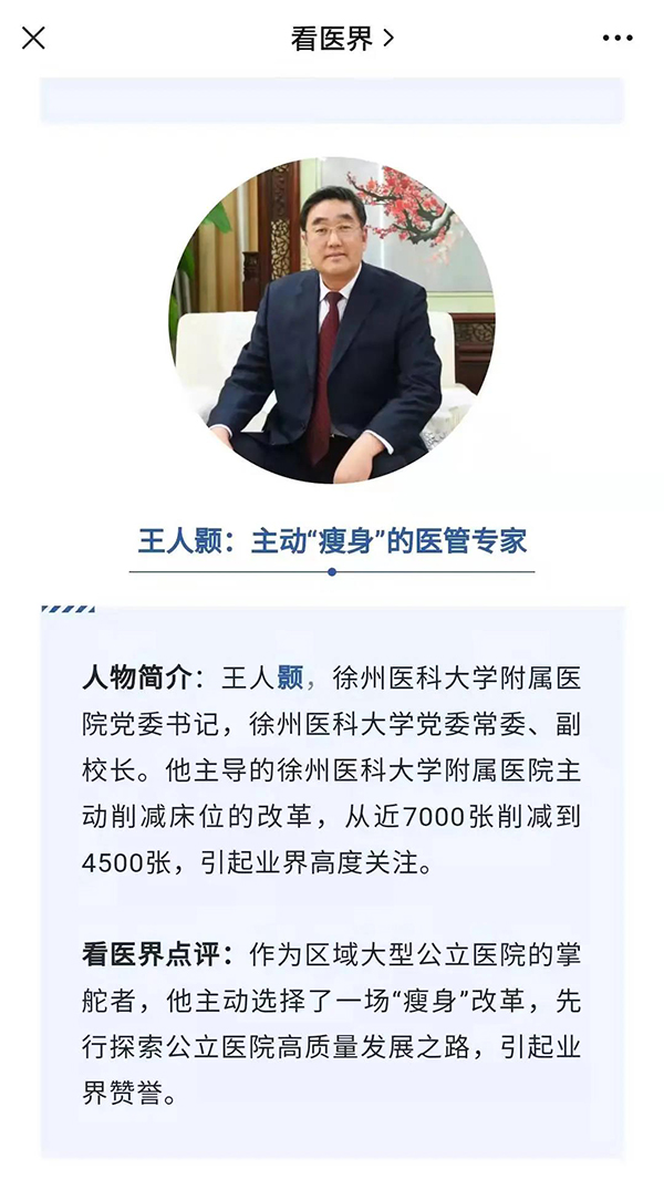 《看醫(yī)界》介紹王人顥書記為“主動‘瘦身’的醫(yī)管專家”,認為“他主導的徐州醫(yī)科大學附屬醫(yī)院主動削減床位的改革,從近7000張削減到4500張,引起業(yè)界高度關注”,并點評王人顥書記“作為區(qū)域大型公立醫(yī)院的掌舵者,他主動選擇了一場“瘦身”改革,先行探索公立醫(yī)院高質量發(fā)展之路,引起業(yè)界贊譽”。
