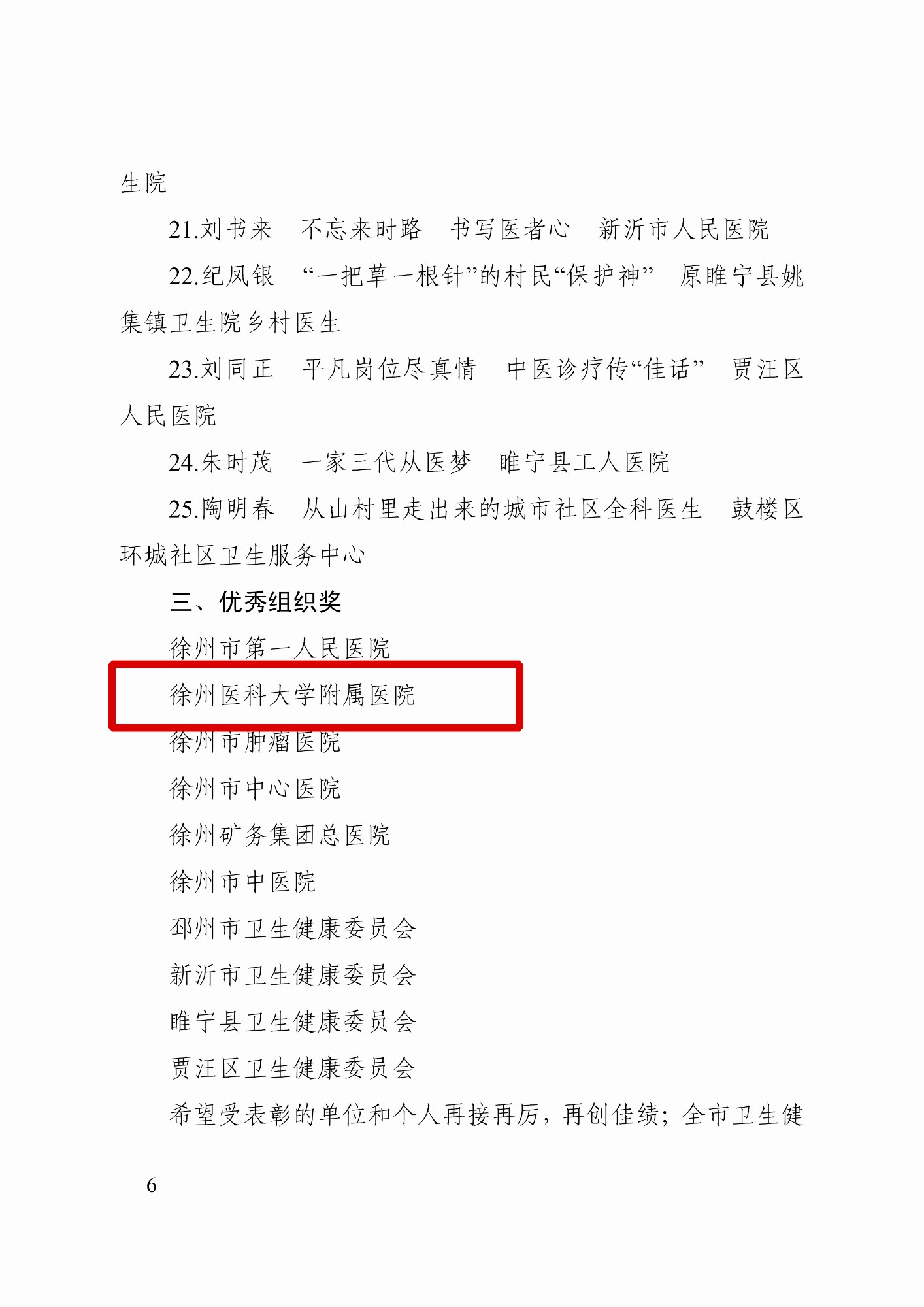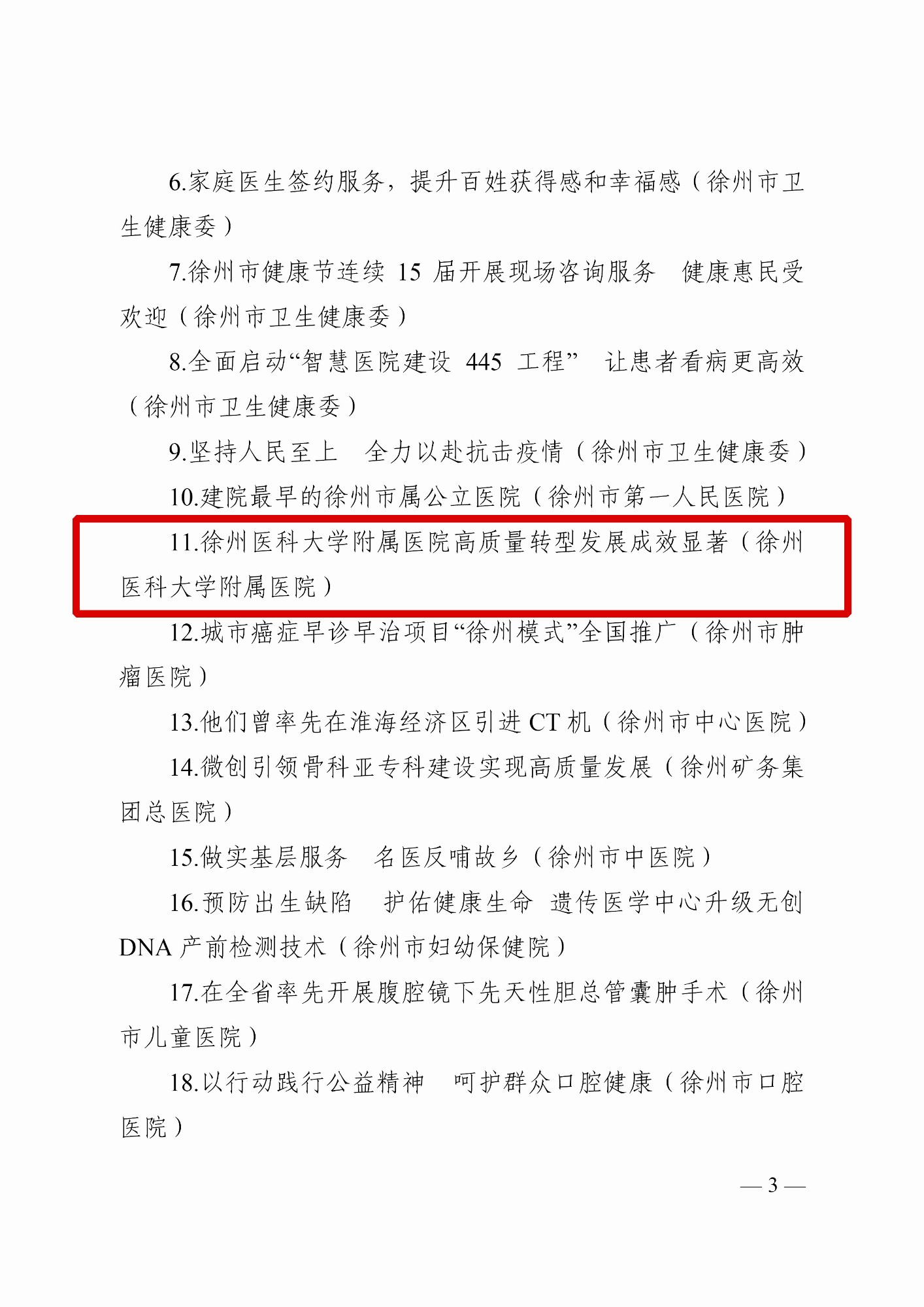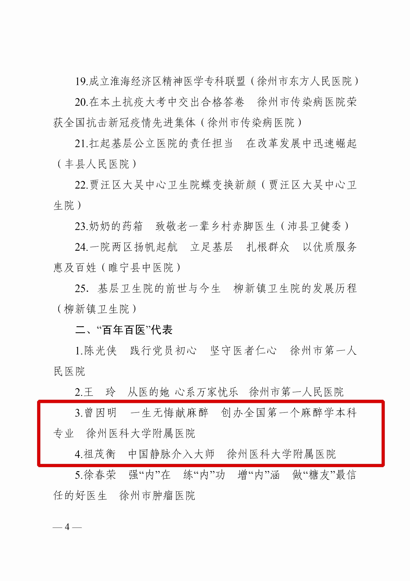 黃淮網(wǎng) 2022年1月26日,徐州市衛(wèi)生健康委員會、徐州報業(yè)傳媒集團(tuán)聯(lián)合發(fā)布文件,表彰了徐州市衛(wèi)生健康系統(tǒng)“百年百事、百年百醫(yī)”代表。“徐州醫(yī)科大學(xué)附屬醫(yī)院高質(zhì)量轉(zhuǎn)型發(fā)展成效顯著”入選“百年百事”代表;曾因明教授、祖茂衡教授入選“百年百醫(yī)”代表。同時,徐州醫(yī)科大學(xué)附屬醫(yī)院榮獲徐州市衛(wèi)健系統(tǒng)“百年百事、百年百醫(yī)”風(fēng)采展活動“優(yōu)秀組織獎”。