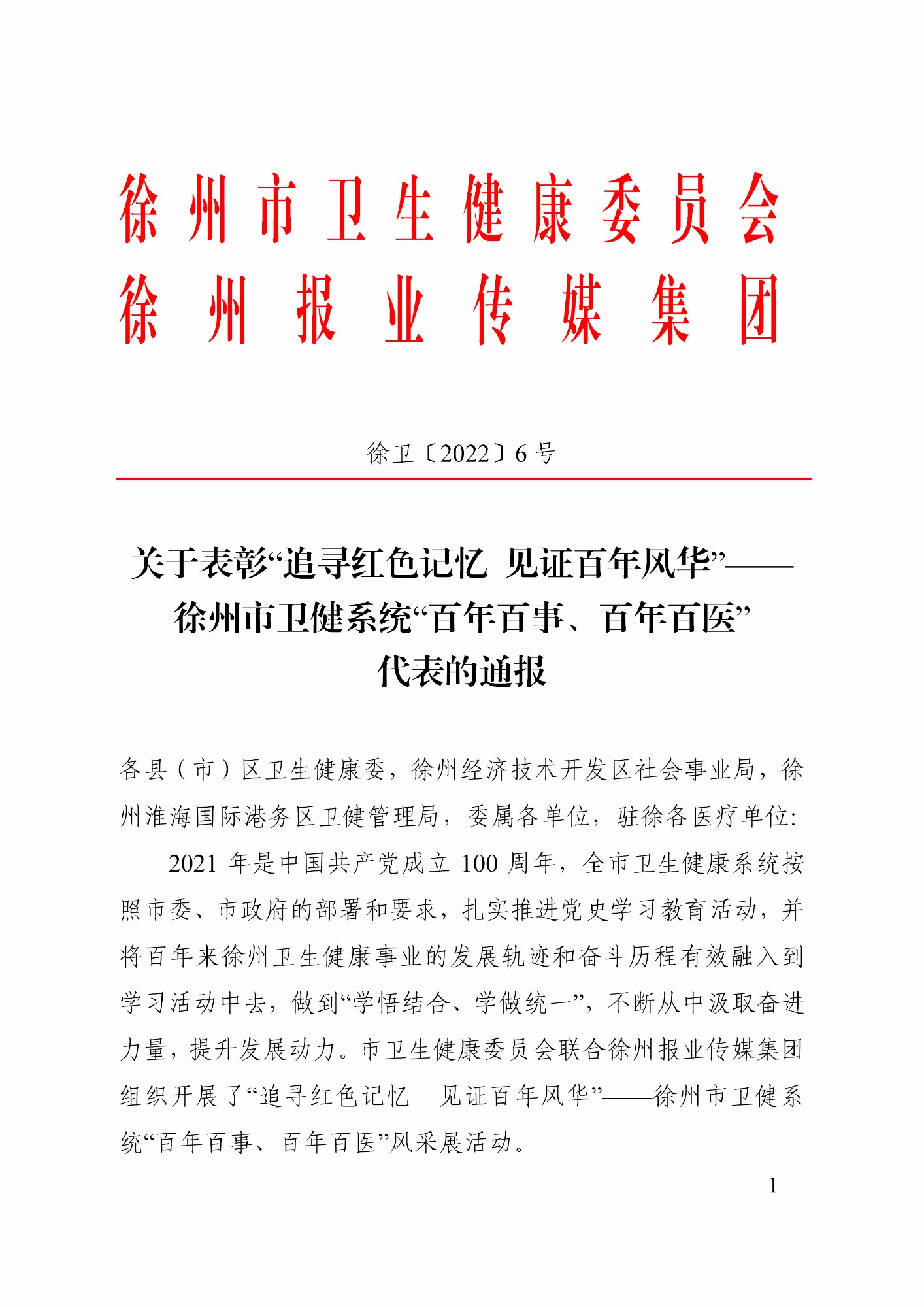 2021 年是中國共產(chǎn)黨成立 100 周年。徐州市衛(wèi)生健康委員會聯(lián)合徐州報業(yè)傳媒集團(tuán)組織開展了“追尋紅色記憶 見證百年風(fēng)華”——徐州市衛(wèi)健系統(tǒng)“百年百事、百年百醫(yī)”風(fēng)采展活動,共遴選出25 件“百年百事”和25 位“百年百醫(yī)”代表。通過活動評選,回憶一百年以來,衛(wèi)生健康系統(tǒng)廣大于職工在黨的領(lǐng)導(dǎo)下,秉持“人民至上、生命至上”,為保障人民群眾生命健康安全作出的突出貢獻(xiàn),展現(xiàn)建設(shè)“健康徐州”、打造淮海經(jīng)濟(jì)區(qū)醫(yī)療高地建設(shè)所取得的光輝歷史和偉大成就。
