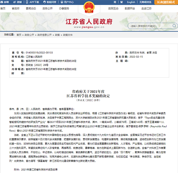 江蘇省人民政府公布了2021年度江蘇省科學(xué)技術(shù)獎(jiǎng)勵(lì)的決定。此次共有263個(gè)項(xiàng)目獲江蘇省科學(xué)技術(shù)獎(jiǎng),其中一等獎(jiǎng)44項(xiàng),二等獎(jiǎng)76項(xiàng),三等獎(jiǎng)143項(xiàng)。