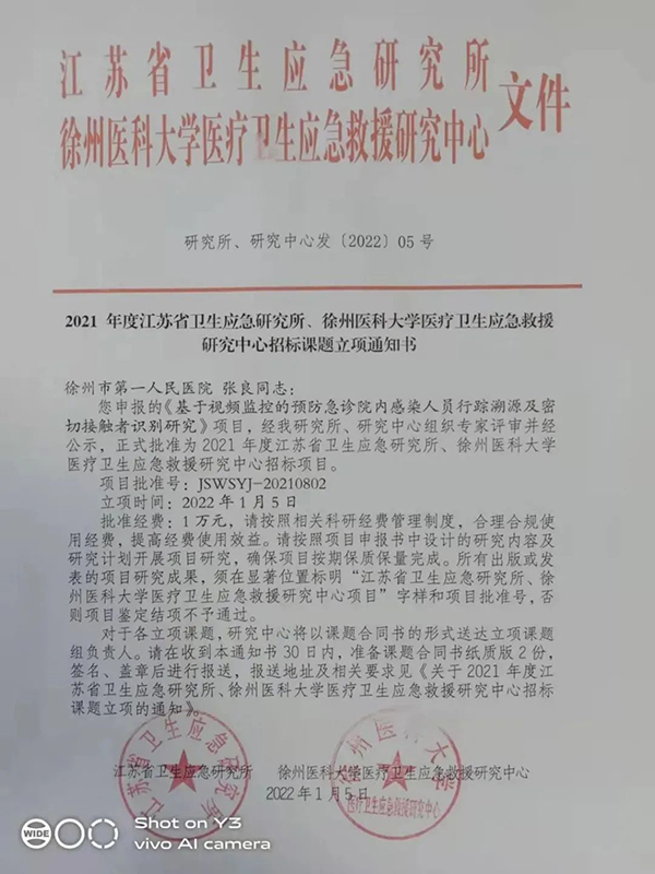 黃淮網(wǎng)(李莉 李泳)根據(jù)2021年度江蘇省衛(wèi)生應(yīng)急研究所、徐州醫(yī)科大學(xué)醫(yī)療衛(wèi)生應(yīng)急救援研究中心招標(biāo)課題立項(xiàng)通知書(shū)(研究所、研究中心發(fā)【2022】05號(hào)),徐州市第一人民醫(yī)院急診醫(yī)學(xué)科主任張良同志申報(bào)的《基于視頻監(jiān)控的預(yù)防急診院內(nèi)感染人員行蹤溯源及密切接觸者識(shí)別研究》項(xiàng)目獲批立項(xiàng)。