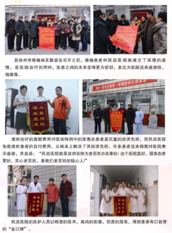 2009年5月成立的血液凈化中心是徐州市慈善總會、徐州市民政局和徐州市衛(wèi)生局的大力支持下新設(shè)立的一個以解決低保、特困腎衰患者透析難、透析貴問題為主的科室,經(jīng)省衛(wèi)生廳檢查驗收,血液透析中心達到二級甲等標準,填補了市區(qū)二級醫(yī)院無透析室的空白,同時也是全國唯一一家免費透析的醫(yī)院,承擔著徐州市區(qū)低保、特困尿毒癥患者的透析任務(wù),每月可透析2200多人次,基本滿足了市區(qū)低保尿毒癥患者的治療需求。