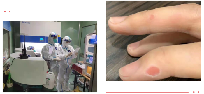 自2020年1月新冠疫情爆發(fā),徐州婦幼檢驗(yàn)團(tuán)隊(duì)逆行走過了一座又一座兄弟城市,南京、揚(yáng)州、常州、連云港都留下了她們的足跡,她們用技術(shù)和堅(jiān)持點(diǎn)亮了一個(gè)又一個(gè)希望。3月7日,連云港出現(xiàn)一例陽性病例,檢驗(yàn)科積極響應(yīng)上級(jí)號(hào)召,派出兩名90后年輕姑娘-吳昕雨、沈倩倩支援連云港全員核酸檢測,14日,常州出現(xiàn)疫情,她們又馬不停蹄轉(zhuǎn)戰(zhàn)常州。徐州此輪疫情發(fā)生時(shí),她們剛回徐隔離修養(yǎng)3天,可是連家也沒回的她們毫不猶豫投入到家鄉(xiāng)的全員核酸檢測中。當(dāng)家人問起近況時(shí),兩位姑娘的回復(fù)卻是:“時(shí)間緊張,回家再聊,我要繼續(xù)干活了。”看著她們因取樣早已磨破的手指,不少同事都悄悄抹了眼淚。