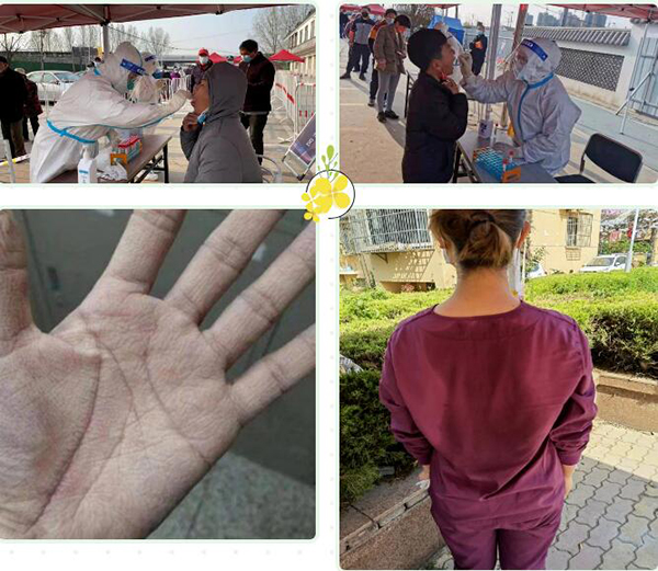 在核酸采樣隊(duì)中,有5名同志連續(xù)多地作戰(zhàn),她們叫徐莉、荊夢晴、尚建俠、劉嬌、王夢迪。她們之中有的有兩歲左右的寶寶需要照顧;有的愛人也在醫(yī)院上班,經(jīng)常加班加點(diǎn);有的是熱戀中的情侶;有的有年邁的父母需要照料。但她們堅(jiān)定地認(rèn)為:作為黨員,在急難險重的關(guān)鍵時刻,要顧全大局,講奉獻(xiàn),必須沖鋒在前。