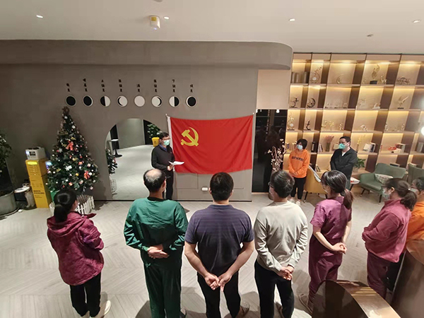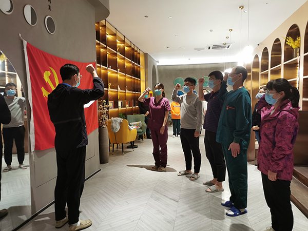 4月19日,在完成當(dāng)天的核酸采樣任務(wù)后,李承宗召集黨員和入黨積極分子在駐地酒店召開臨時黨組織會議,大家學(xué)習(xí)了黨的章程,重溫了入黨誓詞,紛紛表示,將不忘初心,牢記使命,用實際行動踐行“黨旗飄在一線、堡壘筑在一線、黨員沖在一線”。目前,徐醫(yī)附院感染管理科科王進(jìn)副主任護(hù)師、普外科陳守坤主治醫(yī)師、神經(jīng)外科張宇醫(yī)師、消化科王春艷醫(yī)師、血液科張申護(hù)師等5位同志在支援蘇州前線向黨組織遞交了《入黨申請書》。